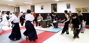 Dans un premier temps, tous les participants à la soirée se sont donc retrouvés sur le tatami (une première pour certains, qui abordaient avec curiosité ce sol moelleux). Chaque groupe a travaillé de son côté un enchaînement de techniques ou de pas de danse qu’il avait mis au point en prévision de la rencontre : pour nous, aïkidokas, il s’agissait de réaliser un enchaînement ikkyo/shiho nage (sans projection)/kote gaeshi/sankyo et irimi nage. Le moins que l’on puisse dire, c’est que réaliser cette suite de techniques sur fond de djembé est très déstabilisant ! Il était également très intéressant d’observer que la difficulté à se placer sur un rythme commun a fini par disparaître au fur et à mesure des enchaînements…et du lâcher-prise.