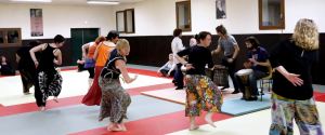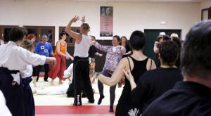 Enfin, l’ensemble des participants a été invité à se mêler aux autres, tout en pratiquant sa propre discipline, ce qui a permis d’assister à des scènes incongrues de pratiquants de Tai Chi évoluant joyeusement aux côtés de danseuses et recevant à leurs pieds des aïkidokas pleins de fougue. De petits exercices ont fini de sceller les liens entre les différents groupes avec bonne humeur et la soirée s’est poursuivie dans l’échange, avec de belles discussions et plusieurs démonstrations, toujours avec bienveillance et un brin de magie.