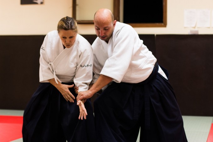 Sur une attaque en yokomen, les techniques de shiho nage, ikkyo, sankyo et kote gaeshi ont ainsi été abordées, afin notamment d’illustrer le travail d’Uke (celui qui initie l’attaque).