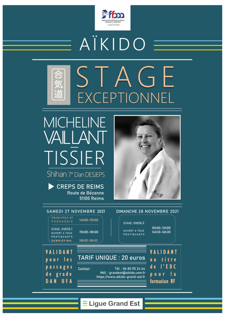 Micheline Vaillant-Tissier Shihan sera également présente le weekend précédent (27 et 28 novembre) à Reims pour un stage de Ligue (voir l’affiche ci-dessous). Le stage est validant à la fois pour le Brevet Fédéral et les passages de grades. On vous en reparle bientôt plus en détails !