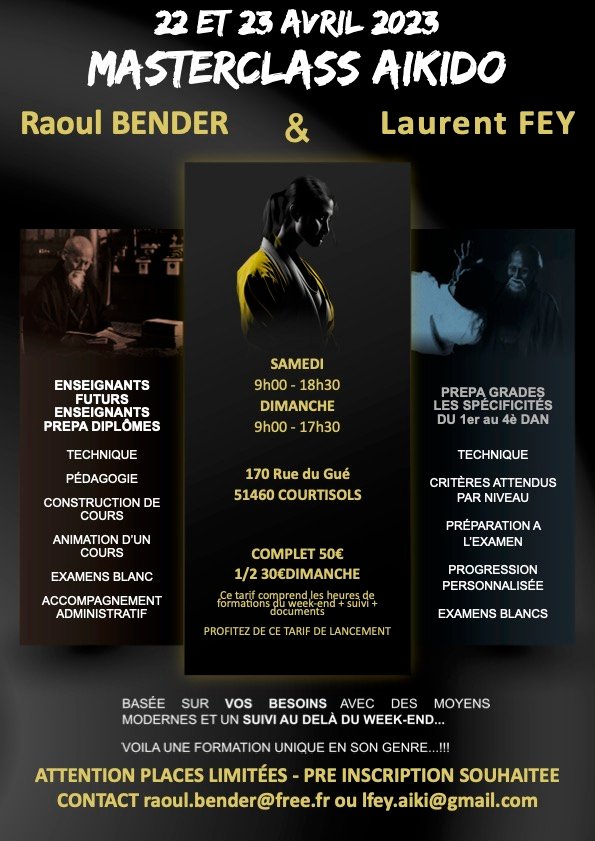 Ainsi, le weekend des 22 et 23 avril, notre Sensei Raoul Bender co-animera avec Laurent Fey deux jours de pratique, orientés autour du Brevet Fédéral et des futurs passages de grade. Vous trouverez toutes les informations sur ce weekend sur l’affiche ci-dessous :