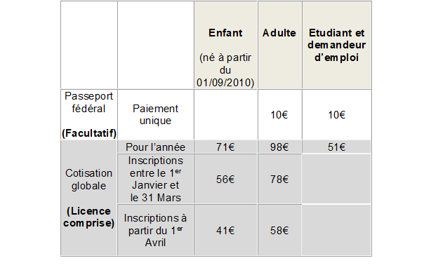 Pour information, les licences fédérales incluses dans les tarifs ci-dessous s’élèvent à 26€ pour les enfants et 38€ pour les adultes.